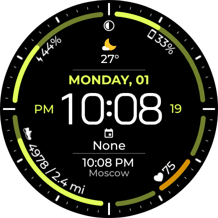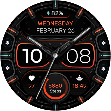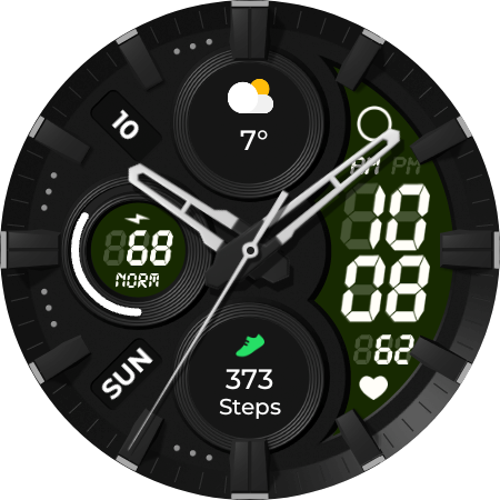Wear OS watch face with 30 colors, weather, heart rate, and moon phases.