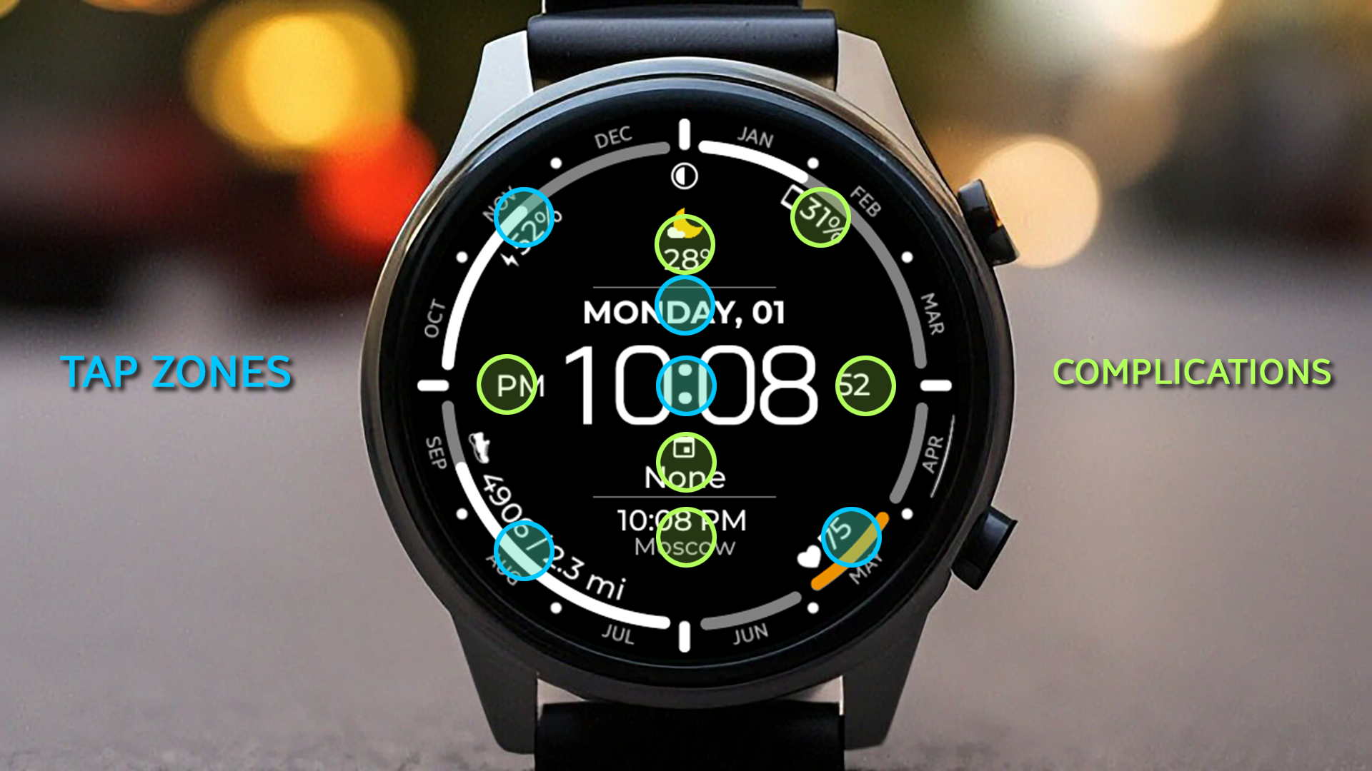 - Complications for selecting information displayed on the watch face.