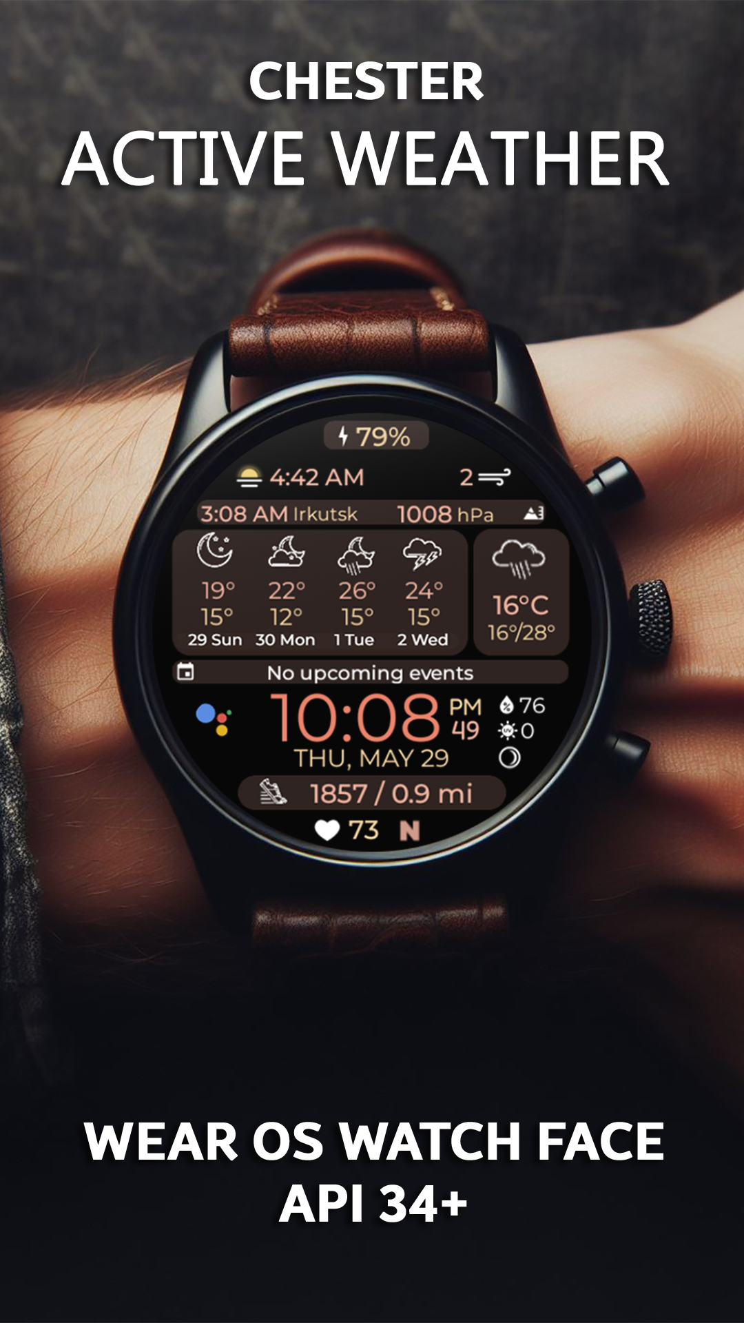 **Chester Active Weather** isn’t just a stylish **watch face** — it’s your personal assistant on the wrist, delivering practical features and rich customization every day.