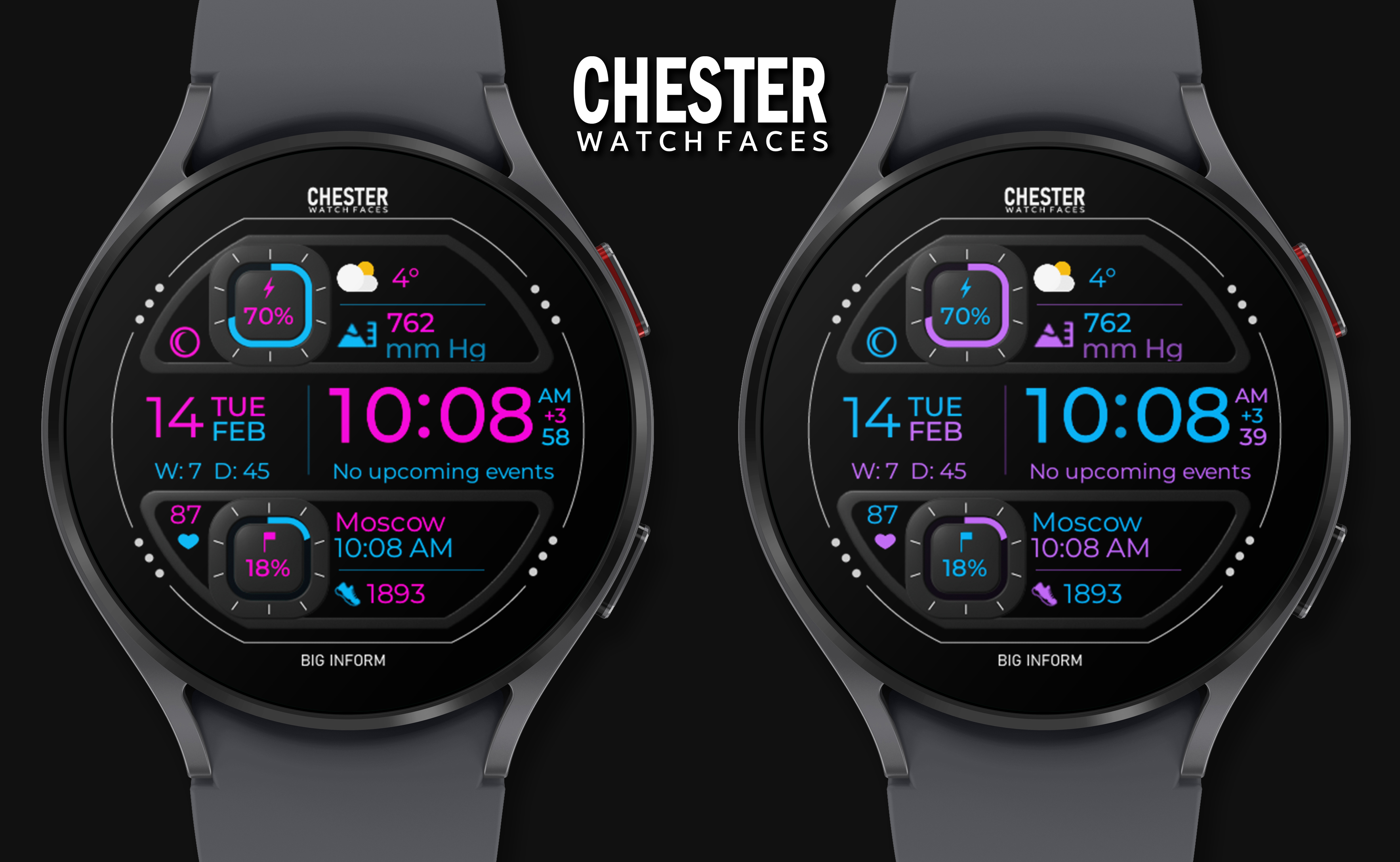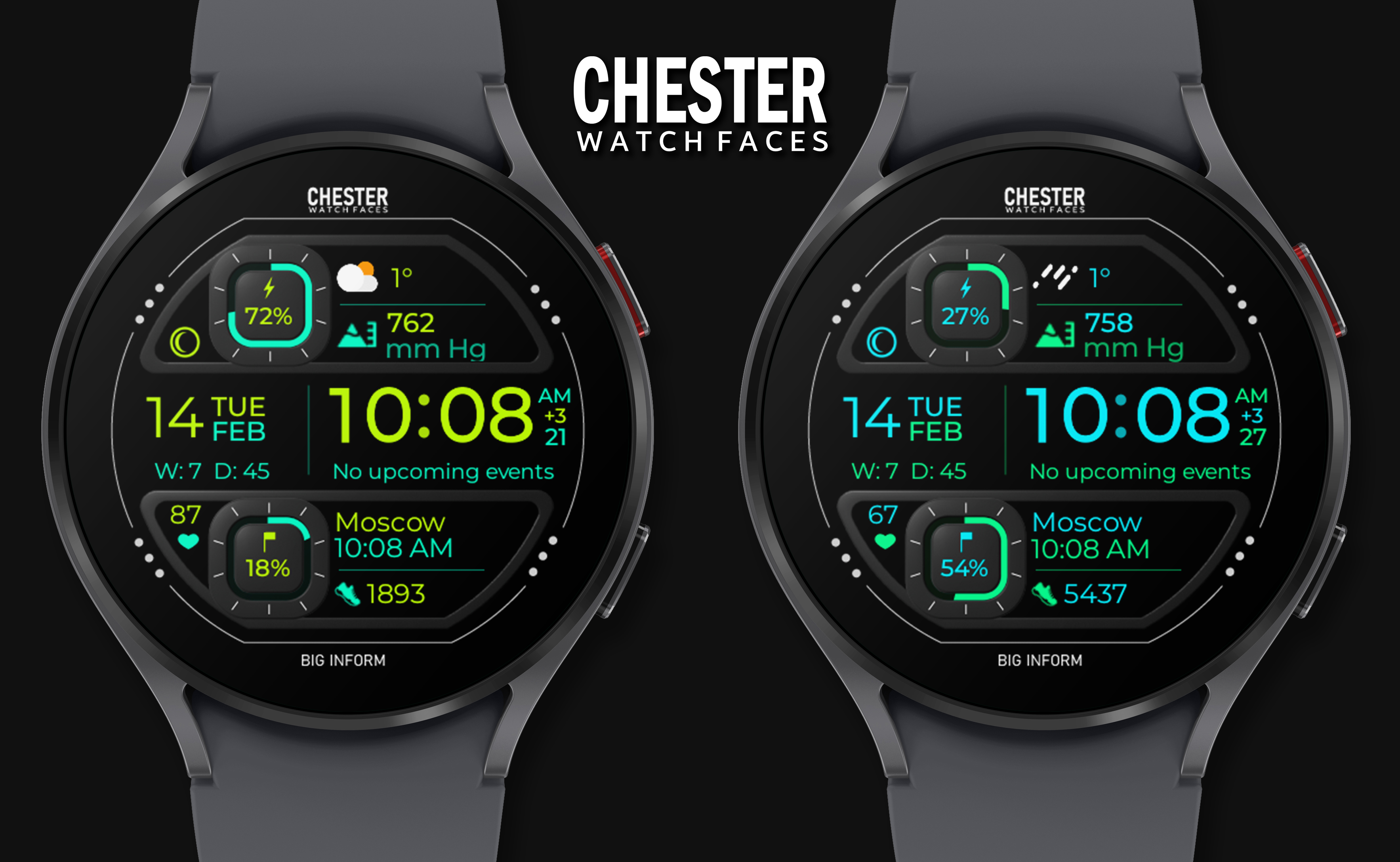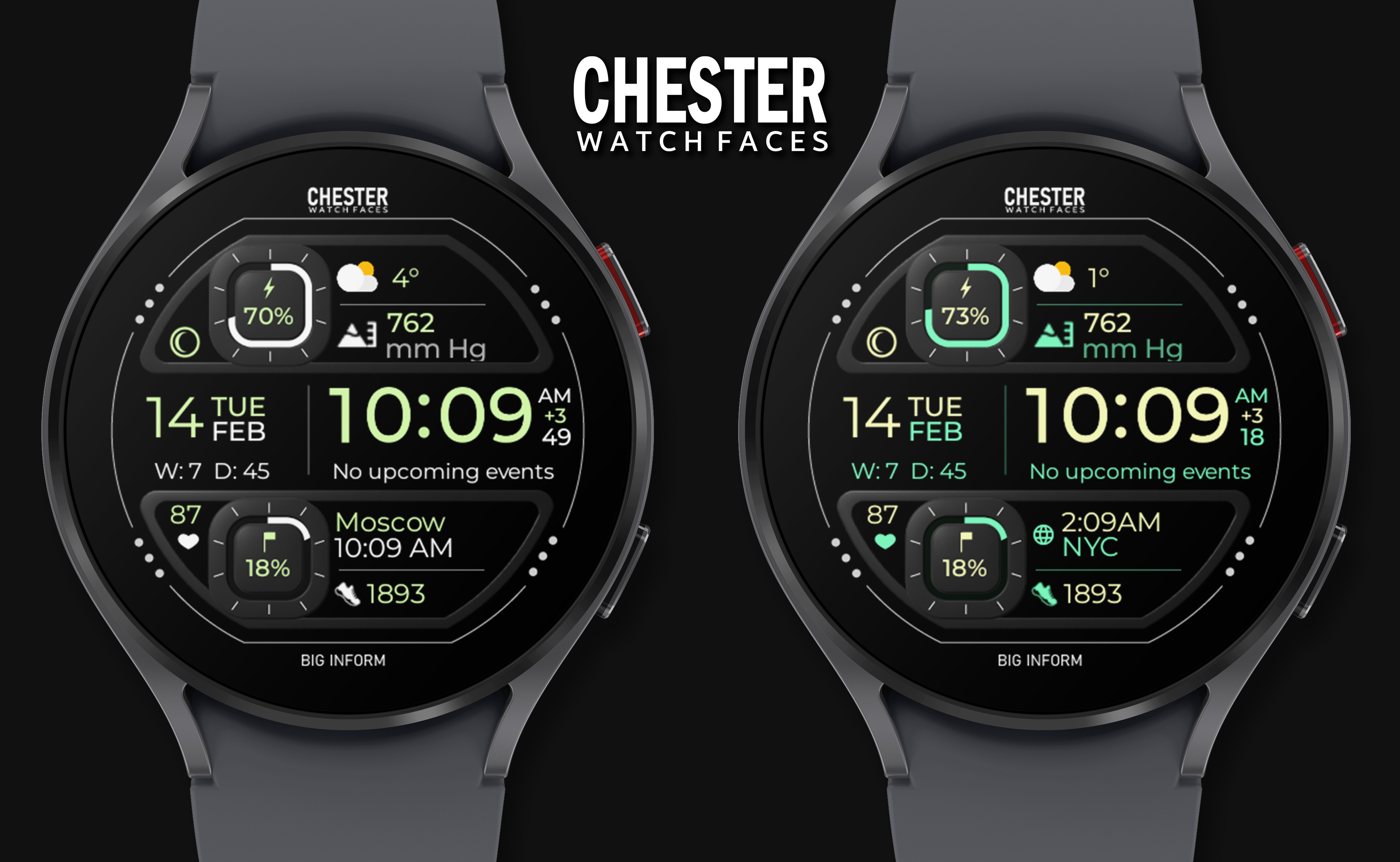 A modern watch face for Wear OS with a lot of information from CHESTER WATCH FACES!