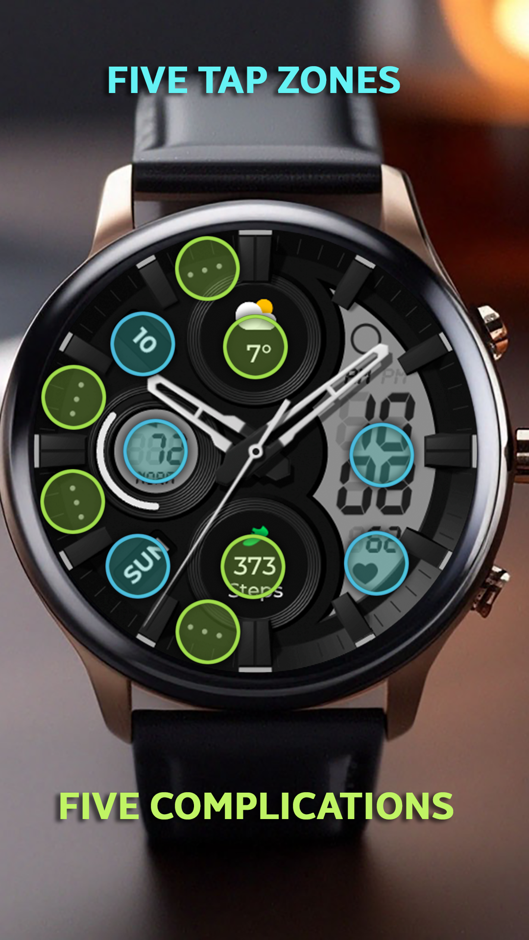 - Complications for selecting information displayed on the watch face.