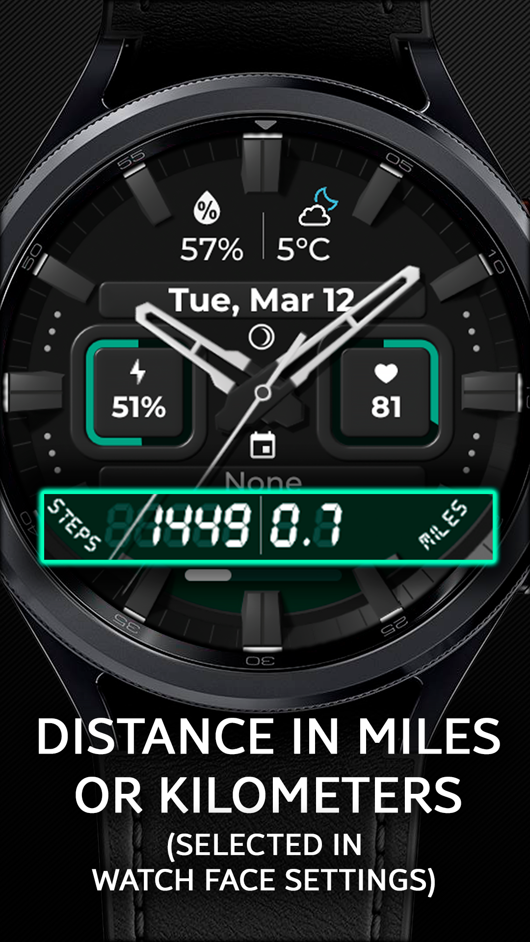 - Select whether to display the distance traveled in miles or kilometers (Select in the watch face settings).