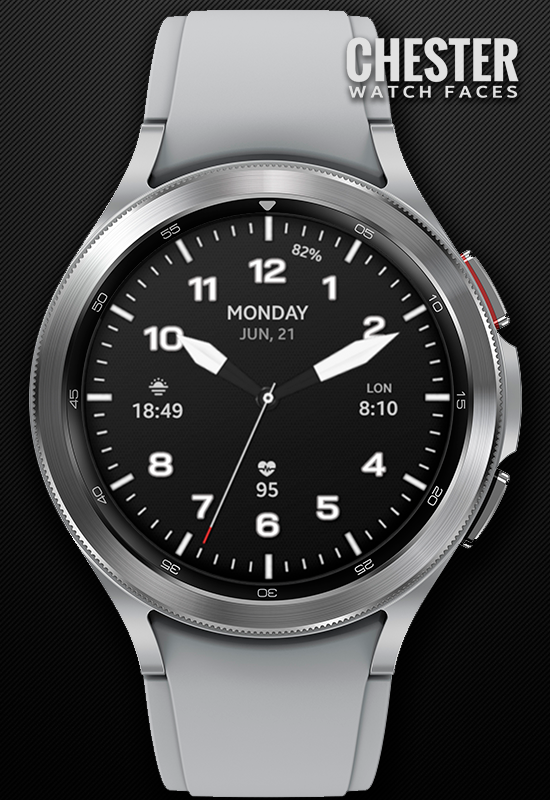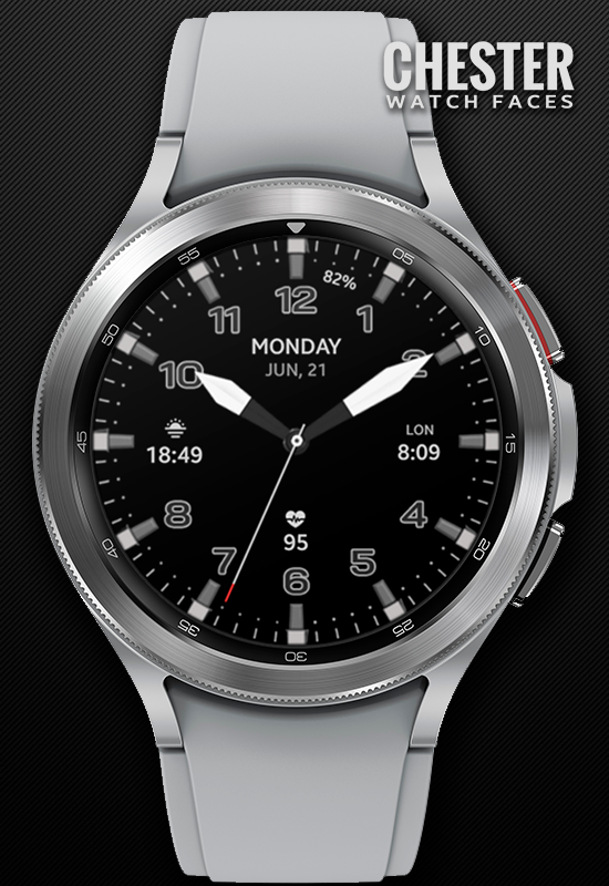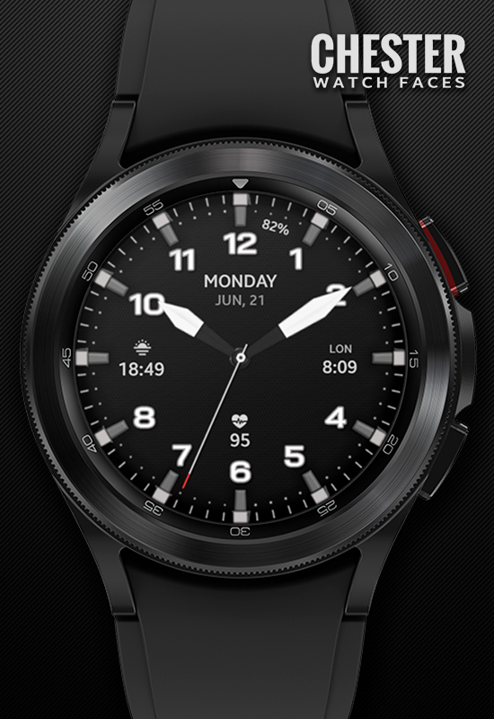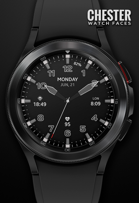 Surprise your friends and loved ones with the stylish CHESTER DARK watch face!