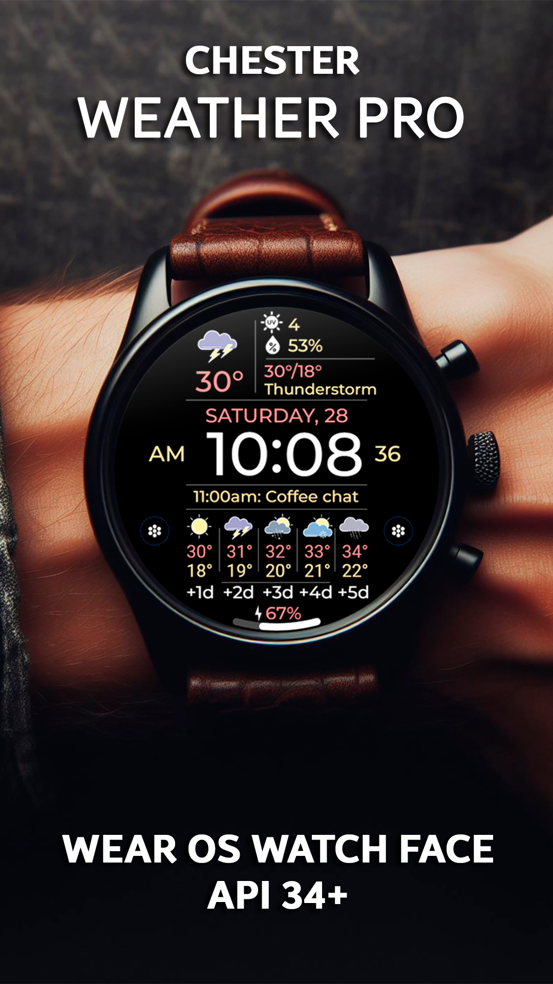 Chester Weather Pro: Stylish Wear OS watch face with customizable weather info.
