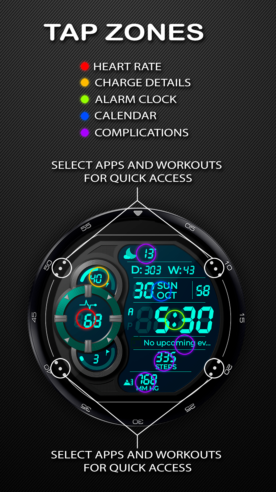 - 4 app and workout app selection zones for quick access.